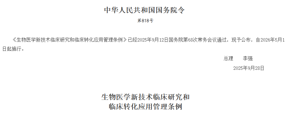 日前,《生物醫(yī)學(xué)新技術(shù)臨床研究和臨床轉(zhuǎn)化應(yīng)用管理條例》(以下簡稱《條例》)正式對外公布。該《條例》此前已獲國務(wù)院常務(wù)會議審議通過,將于2026年5月1日起正式施行,為我國生物醫(yī)學(xué)新技術(shù)的規(guī)范發(fā)展劃定明確框架。